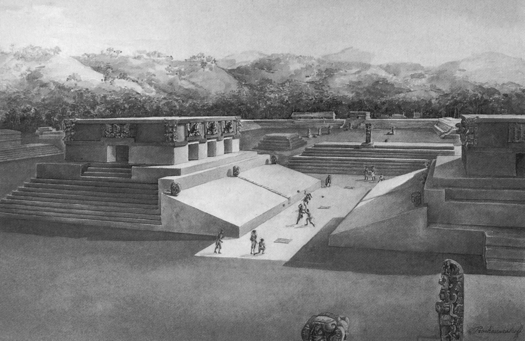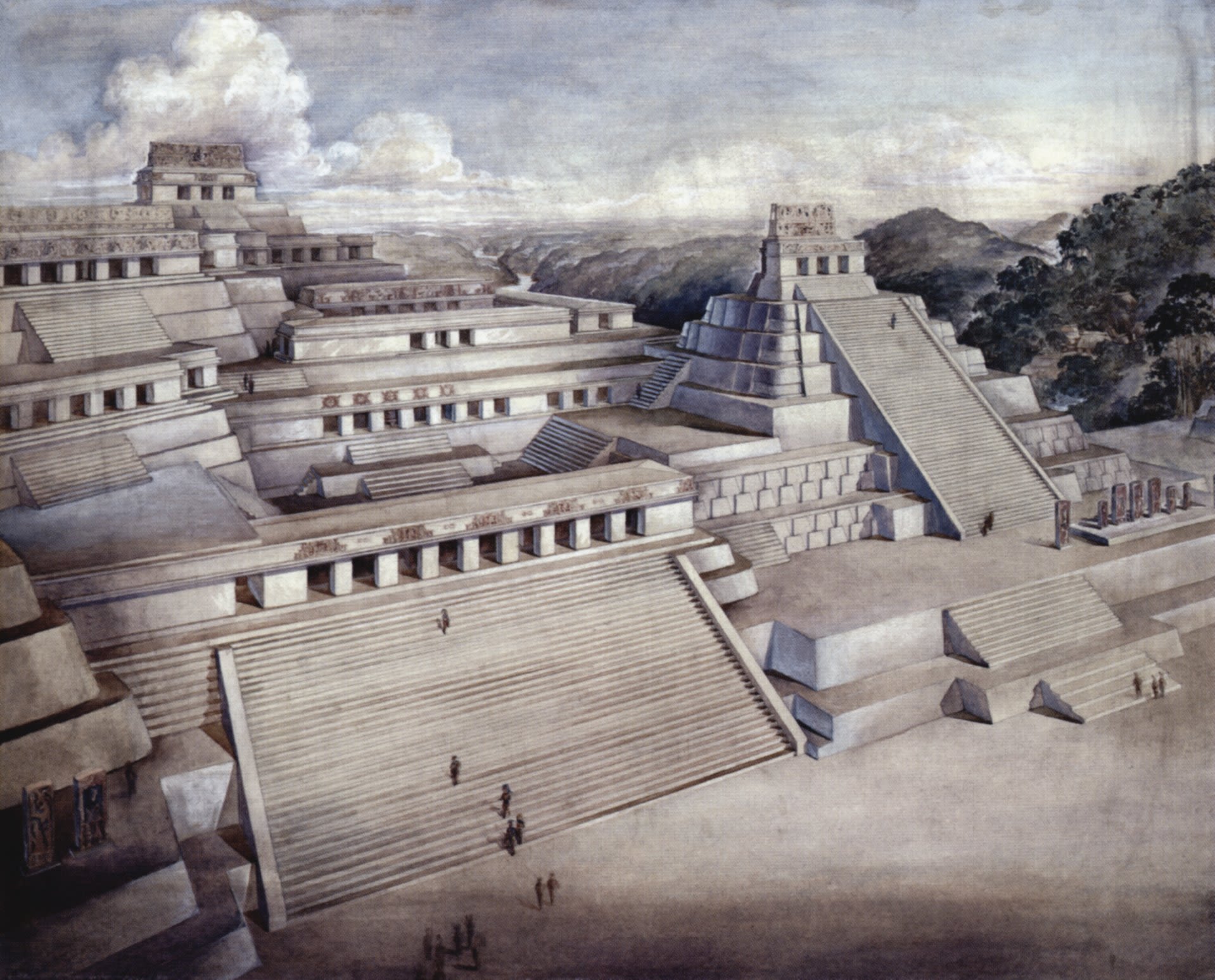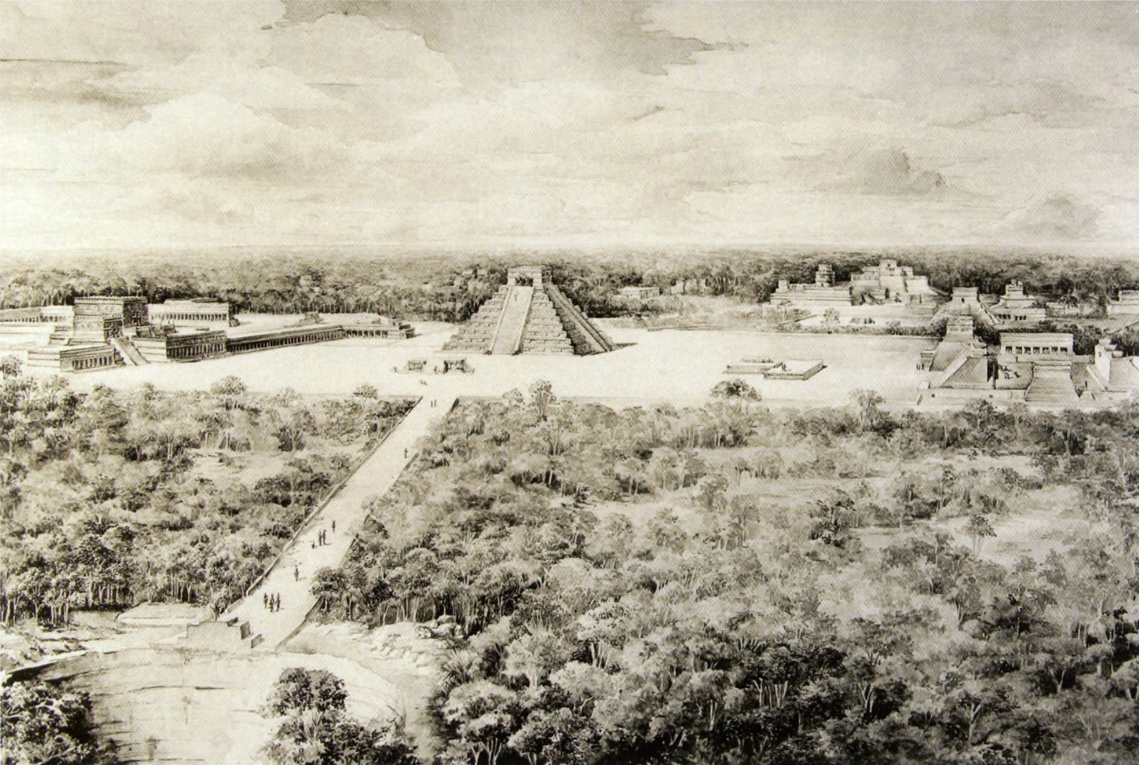 Background: Reconstruction of the city of Chichen Itza, viewed from the north, by Tatiana Proskouriakoff.