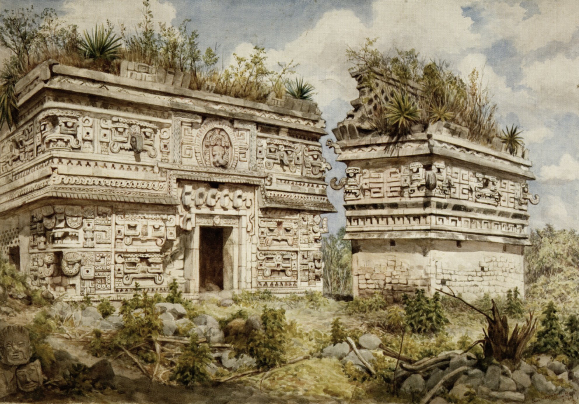 Background: Painting of the Annex of the Casa de las Monjas at Chichen Itza by Adela Breton.