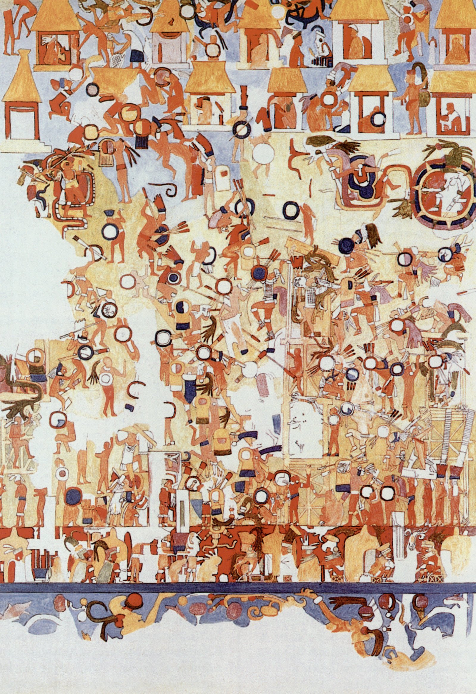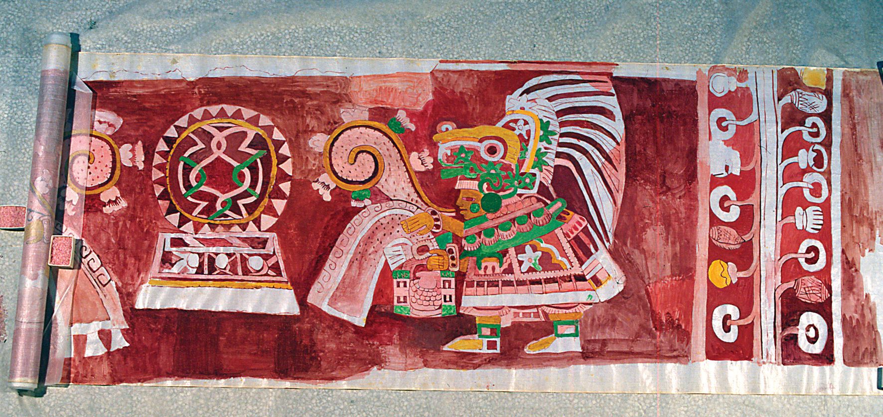 Background: Adela Breton's copy of a portion of the murals in the Upper Temple of the Jaguars at Chichen Itza.