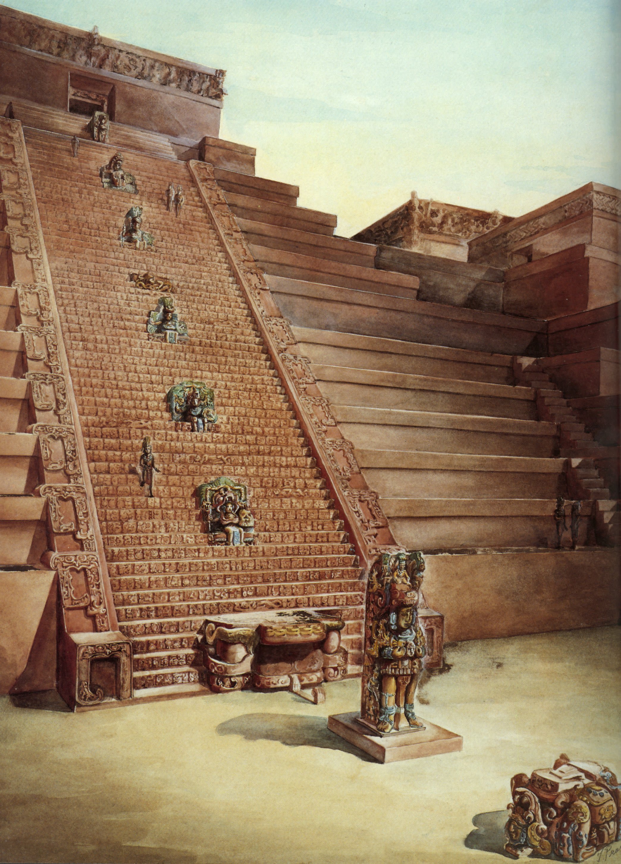 Background: Reconstruction of Stela M and Temple 26 (the Hieroglyphic Stairway) at Copan by Tatiana Proskouriakoff.